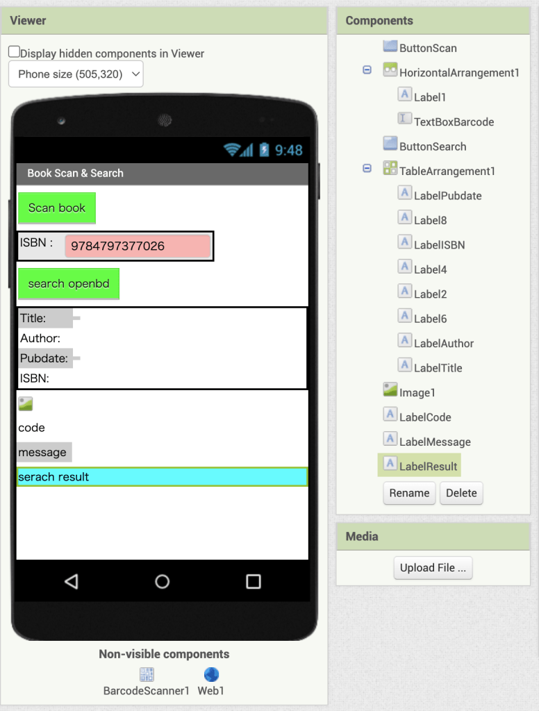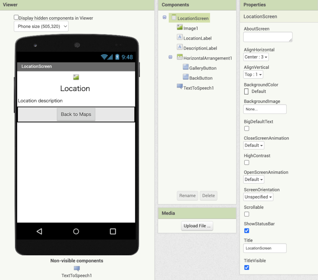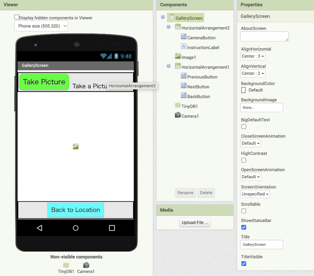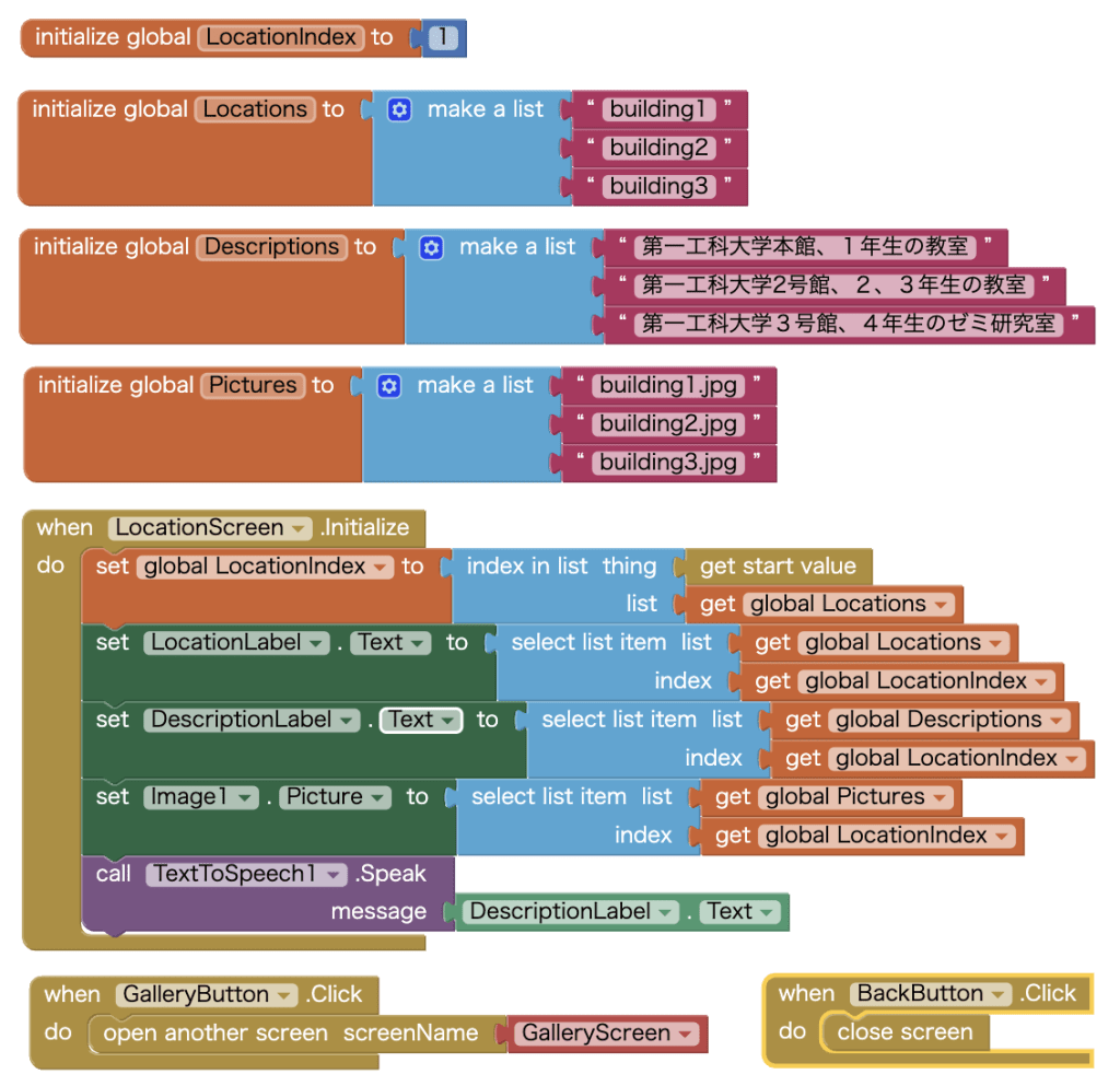 時間の関係で、戻りボタンだけ動作を設定した。