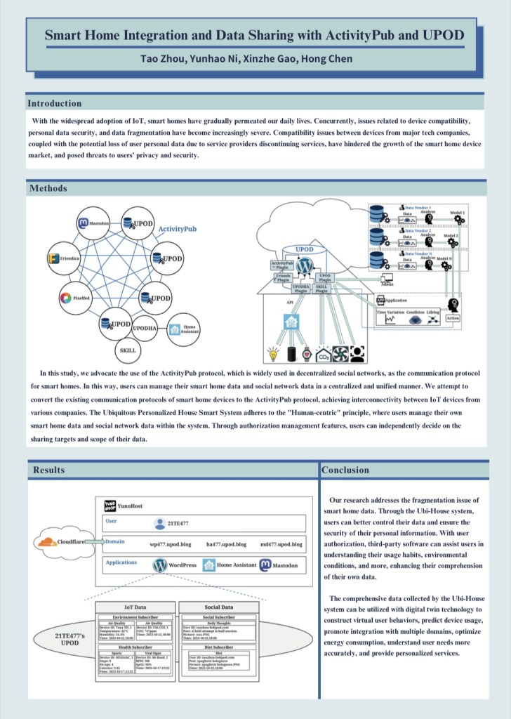 本研究では、スマートホームのデータ断片化とセキュリティ問題に対処するため、ActivityPubプロトコルを採用し、異なる企業のIoTデバイス間の相互接続を実現します。このUbiquitous Personalized House Smart Systemにより、ユーザーは自身のスマートホームとソーシャルネットワークのデータを一元管理し、データ共有の対象と範囲を自決します。また、デジタルツイン技術の実現に必要な、個人の完全なソーシャルネットワークデータとIoTデータを提供し、よりパーソナライズされたサービスの提供に寄与します。