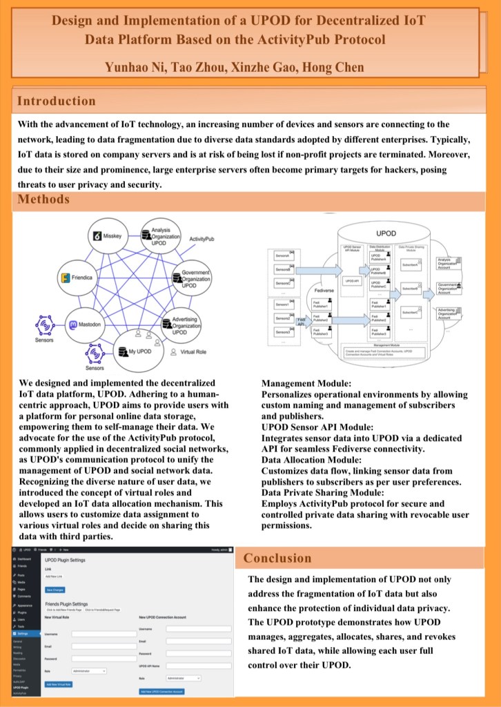 本研究では、ユーザーがオンラインデータを自己管理できる分散型IoTプラットフォーム「UPOD」が開発されました。UPODはソーシャルネットワークデータの統合とプライバシー保護を強化するために、ActivityPubプロトコルとバーチャルキャラクター概念を採用しています。