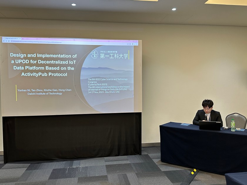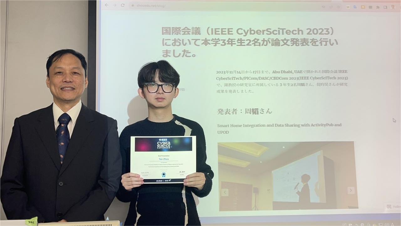 2023年11月14日から17日まで、Abu Dhabi, UAEで開かれた国際会議 IEEE CyberSciTech/PICom/DASC/CBDCom 2023(IEEE CyberSciTech 2023)で、陳教授の研究室に所属している3年生2名周韬さん,倪昀昊さんが研究成果を発表しました。