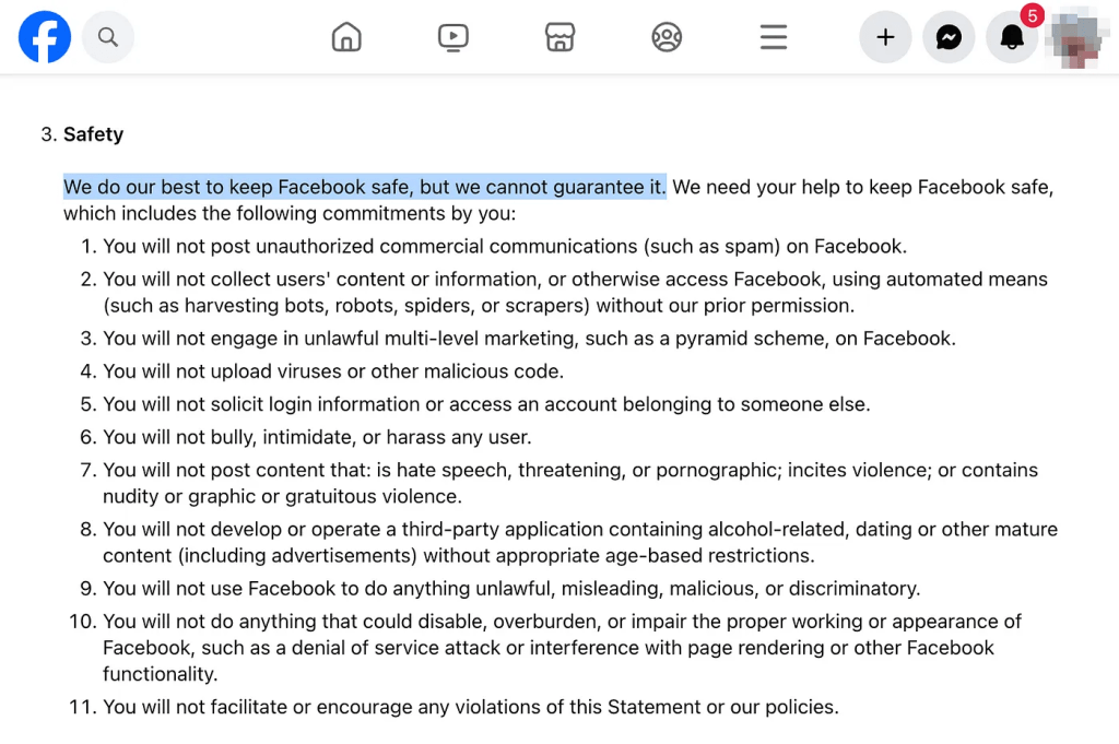 That’s not an exaggeration: Facebook publically states on its terms page that it cannot guarantee our safety.