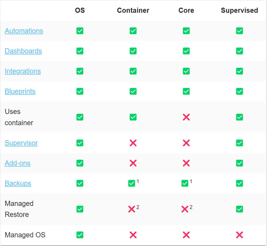 1: Backups for Home Assistant Core and Home Assistant Container is provided by the backup integration. 2: Backups for Home Assistant Core and Home Assistant Container are either a tool to migrate to HAOS or a completely manual restore of the backup.